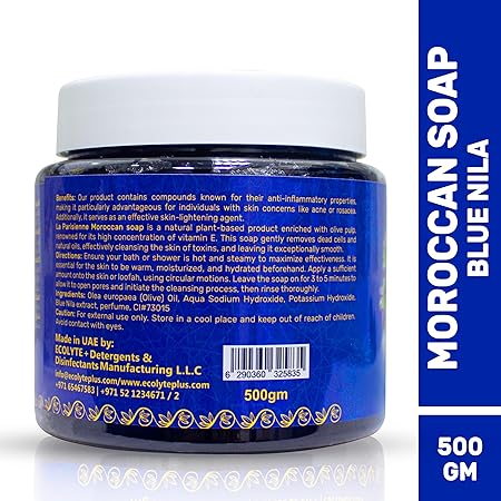 الصابون المغربي الطبيعي مع النيلة الزرقاء من لا باريسيان علاج طبيعي وعضوي 100% للتنظيف والتقشير يناسب جميع أنواع البشرة. مثالي لطقوس الحمّام المغربي، ويأتي بوزن 500 غرام، وغني بالنيلة الزرقاء لتنقية البشرة بعمق، تقشيرها بلطف، وتعزيز تفتيحها وتوحيد لونها بشكل ملحوظ.