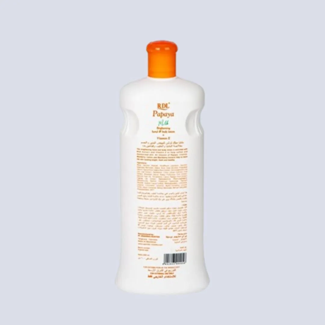 دلّعي بشرتك مع RDL لوشن الحليب بزيت البابايا 600 مل لليدين والجسم – منتج فاخر للعناية بالبشرة مصمّم لترطيب، تفتيح وتنعيم البشرة. تركيبته سريعة الامتصاص تخلي بشرتك ناعمة، منتعشة ومشرقة بدون أي أثر دهني.