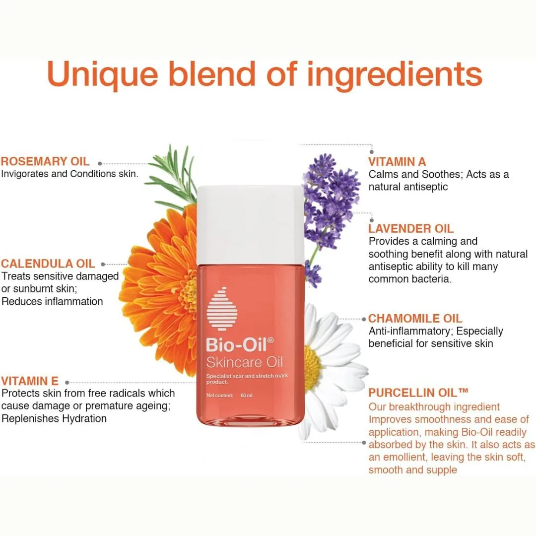 This unique blend of carefully selected ingredients in Bio-Oil Skincare Oil works together to nourish, protect, and improve the appearance of your skin.