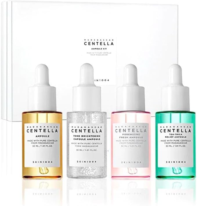 SKIN1004 Madagascar Centella Ampoule Set: Targeted Solutions for Every Skin Need. Unlock the secret to balanced, clear, and radiant skin with the SKIN1004 Madagascar Centella Ampoule Set. This essential collection brings together four uniquely formulated ampoules, allowing you to customize your routine and deliver targeted repair and rejuvenation to your complexion. Each serum is built upon the foundation of pure, high-quality Centella Asiatica to promote skin healing and health.