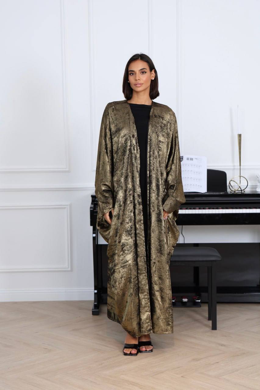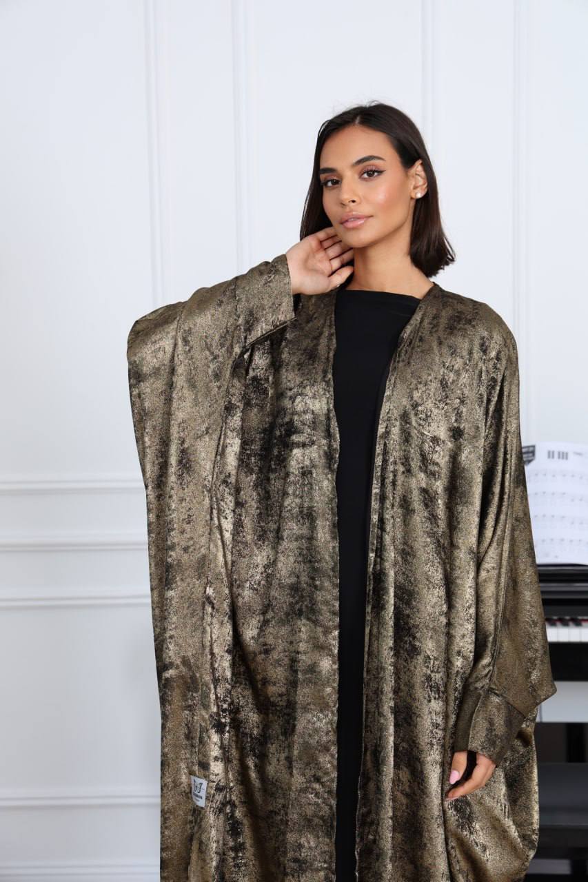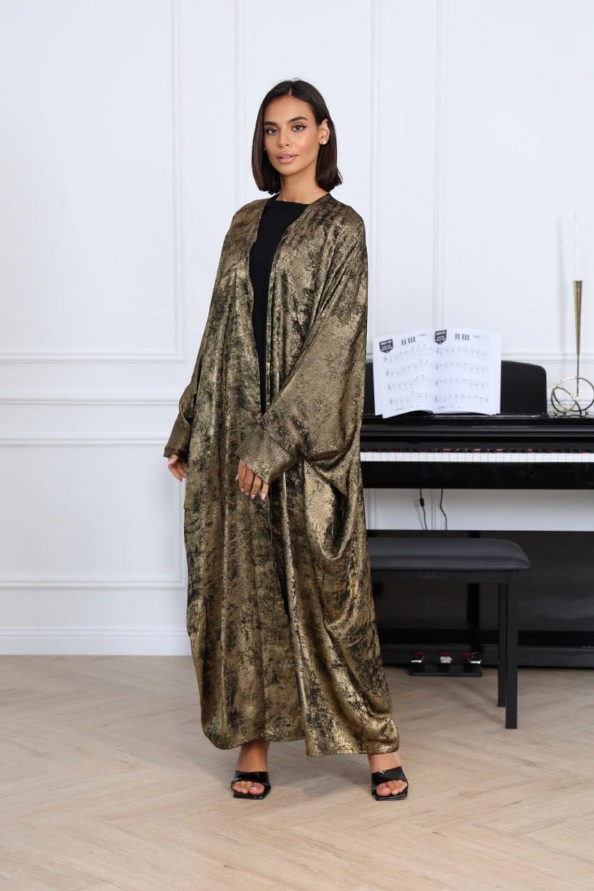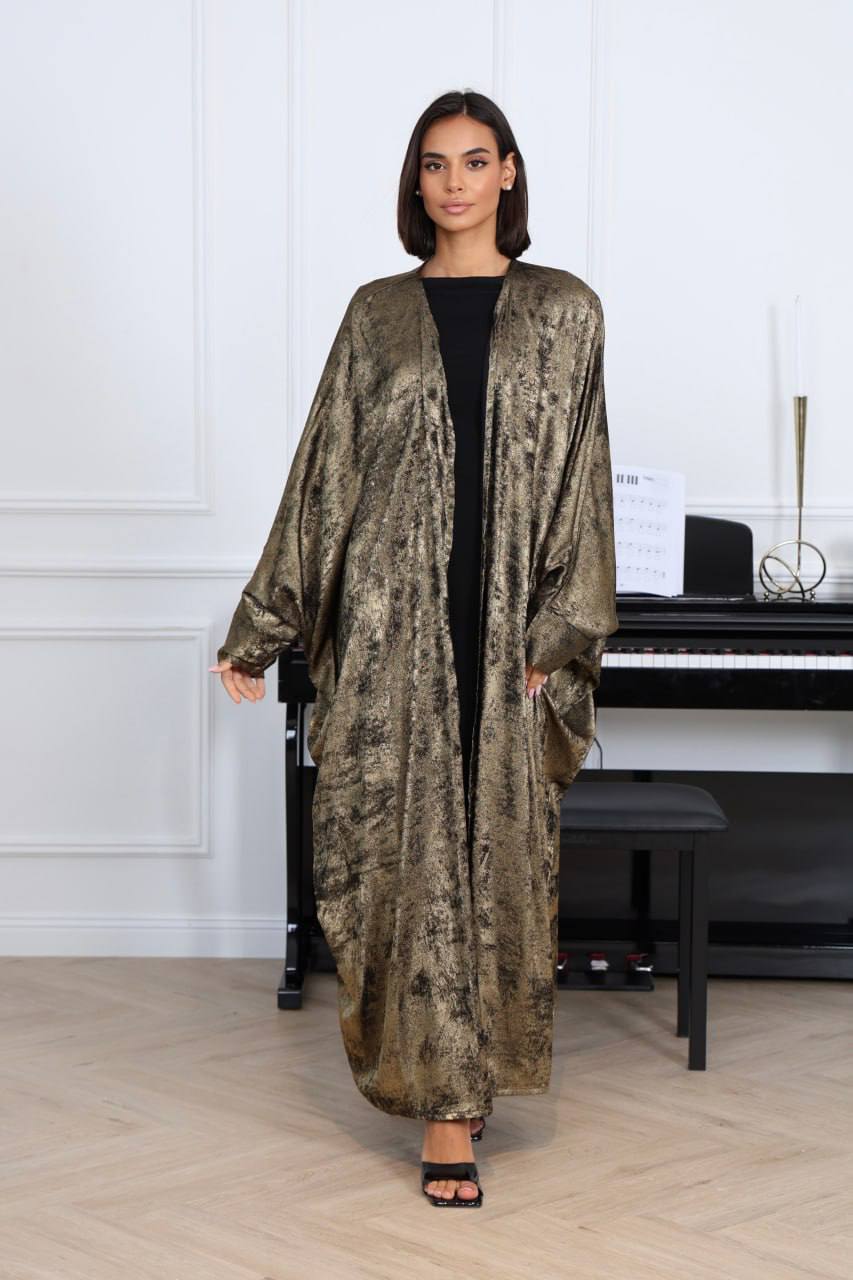Designed in a classic bisht cut with wide sleeves and an easy open-front fit, it moves beautifully as you walk and adds a clear touch of luxury to every detail. Ideal for layering, it completes your outfit effortlessly and gives you a premium occasion look in seconds. The balanced mix of modest elegance and bold metallic detailing makes it a perfect choice for major events, from refined evenings to special celebrations.