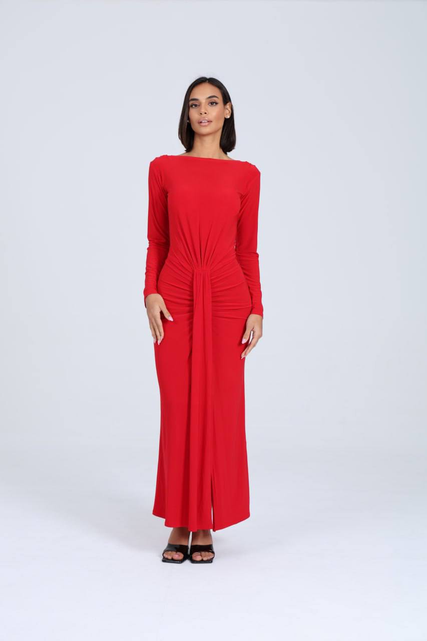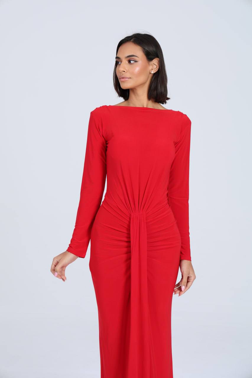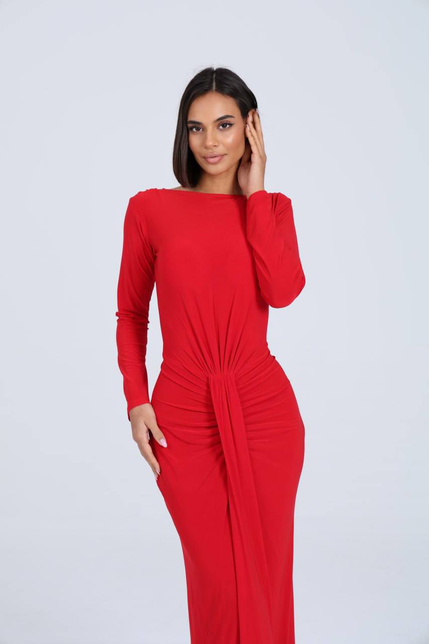 The true charm lies in the carefully designed ruching at the waist and hips, which highlights the waist instantly and enhances curves with a smooth flow over the hips for a sculpted, irresistible look. Paired with a wide neckline and long sleeves, it offers elegant coverage, while the front textured detail adds a striking touch that guarantees all eyes on you—whether for upscale parties or major occasions.